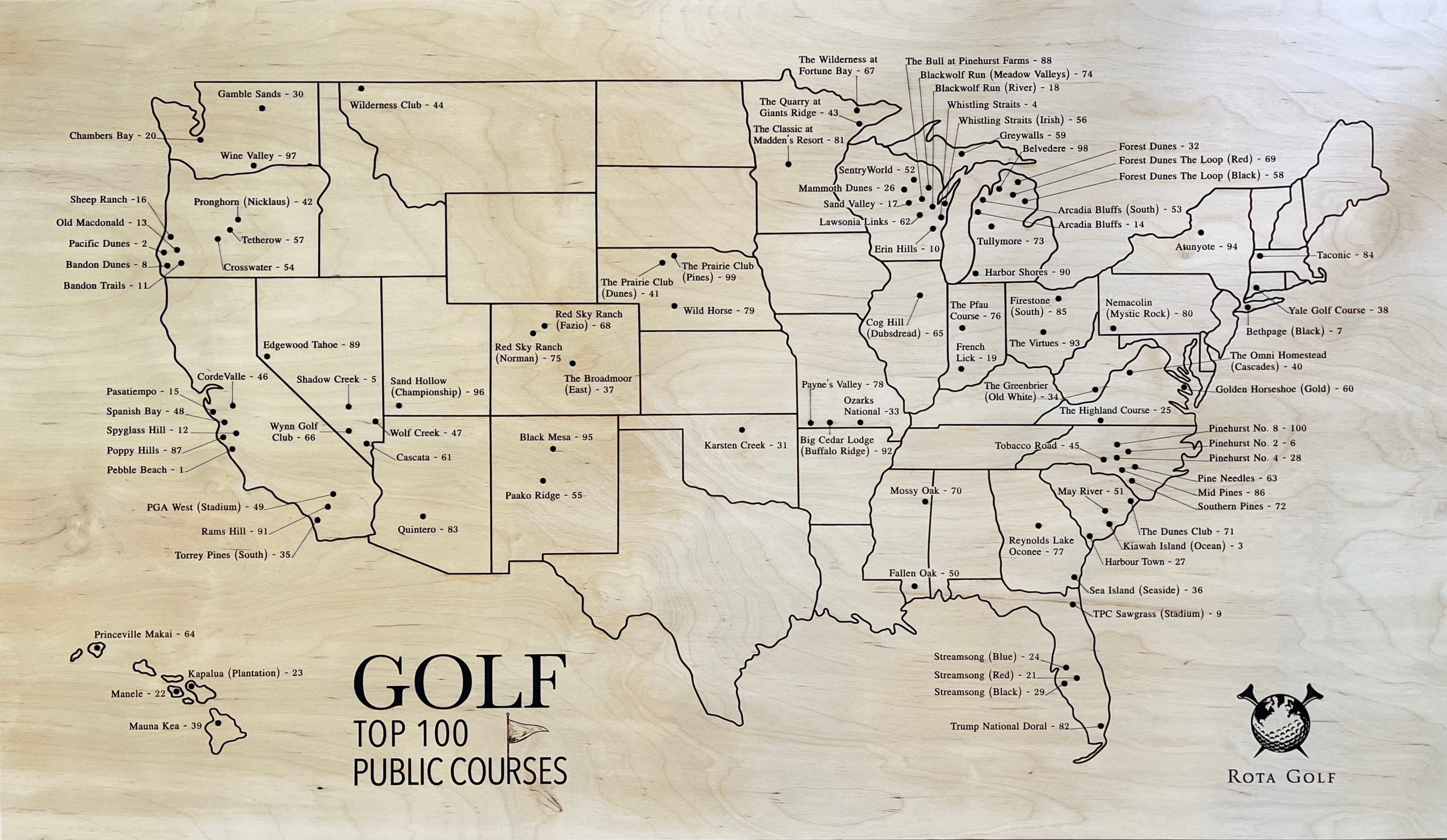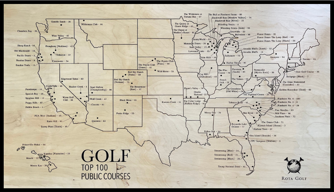 Embodying the spirit of the game, this handcrafted map is your personal caddie to America's Top 100 Public Golf Courses. Track your journey, mark your achievements, and relive your greatest golf moments.