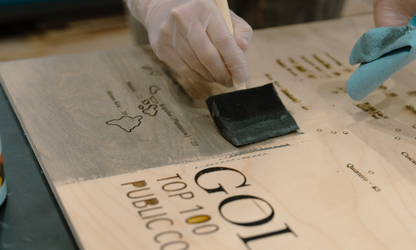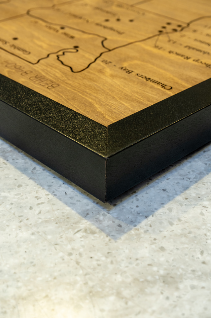 To enhance and preserve the natural beauty of the wood, we hand-stain each piece with specially selected stains and seals. This not only ensures consistent coloration but also allows the wood's inherent characteristics to shine through. Our finishing process is designed to protect and highlight the map, ensuring it remains a cherished piece for years to come.