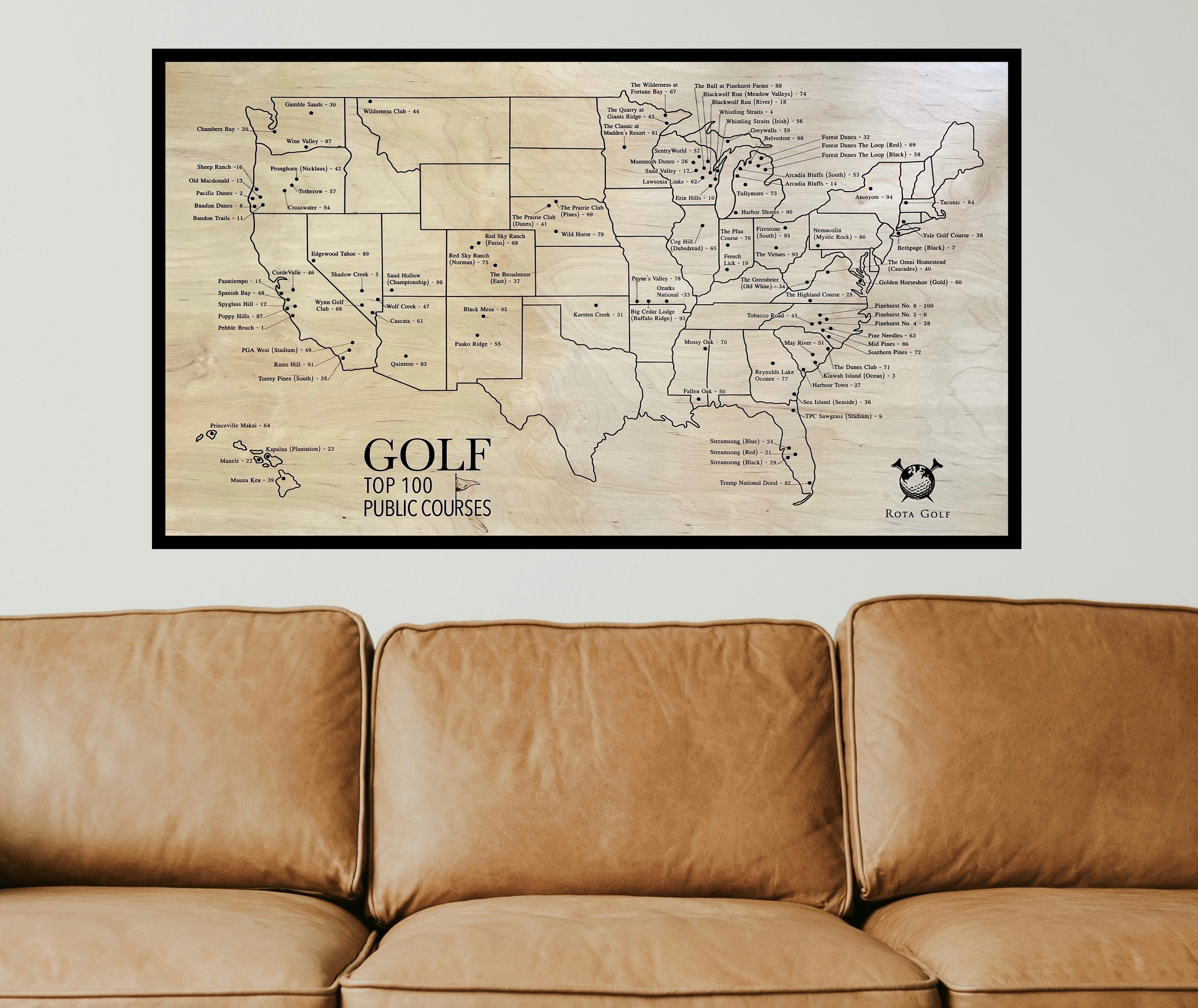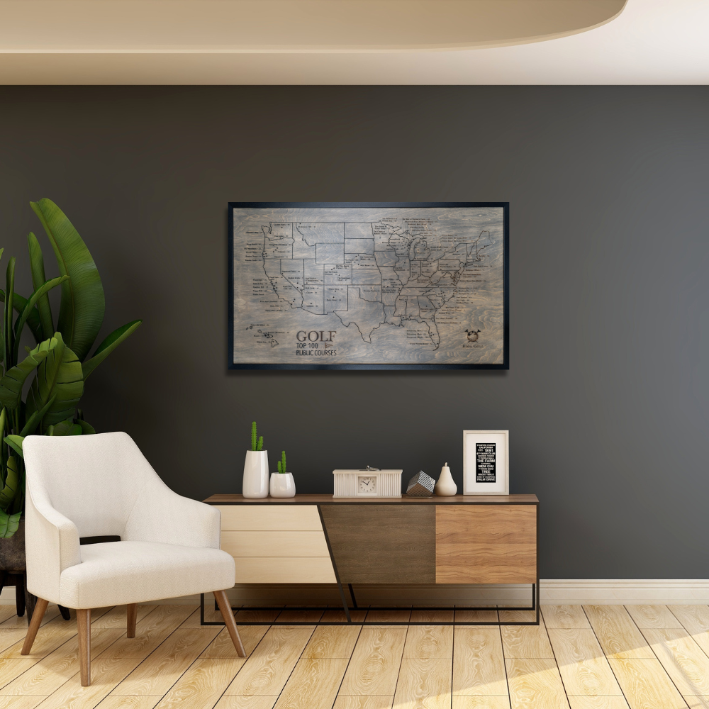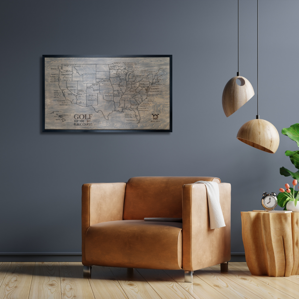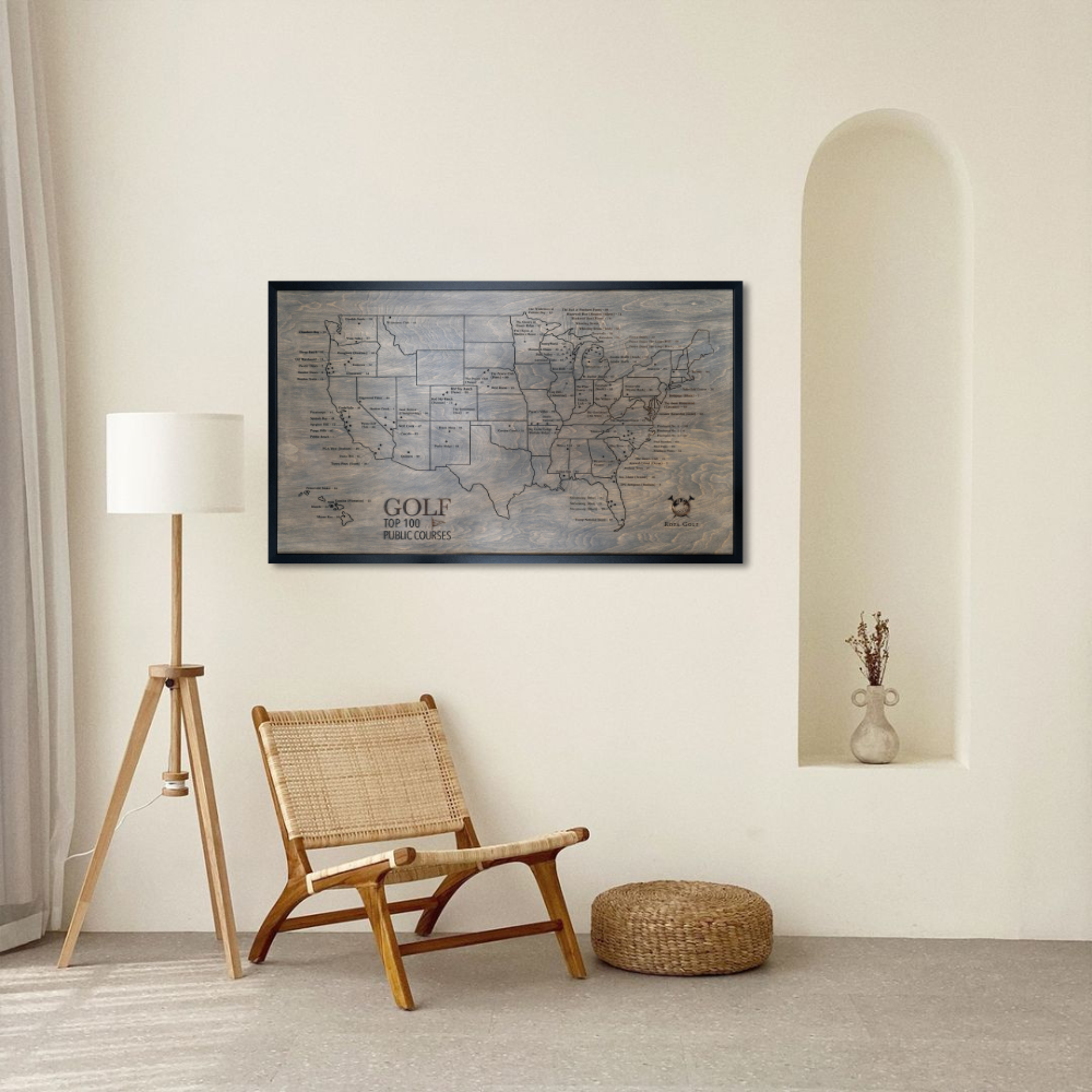 Your journey begins with the Rota Golf map, a distinguished piece showcasing America's Top 100 Public Golf Courses on premium white birch wood. Pre-marked tee holes await your story, ready to mark each course you've experienced.