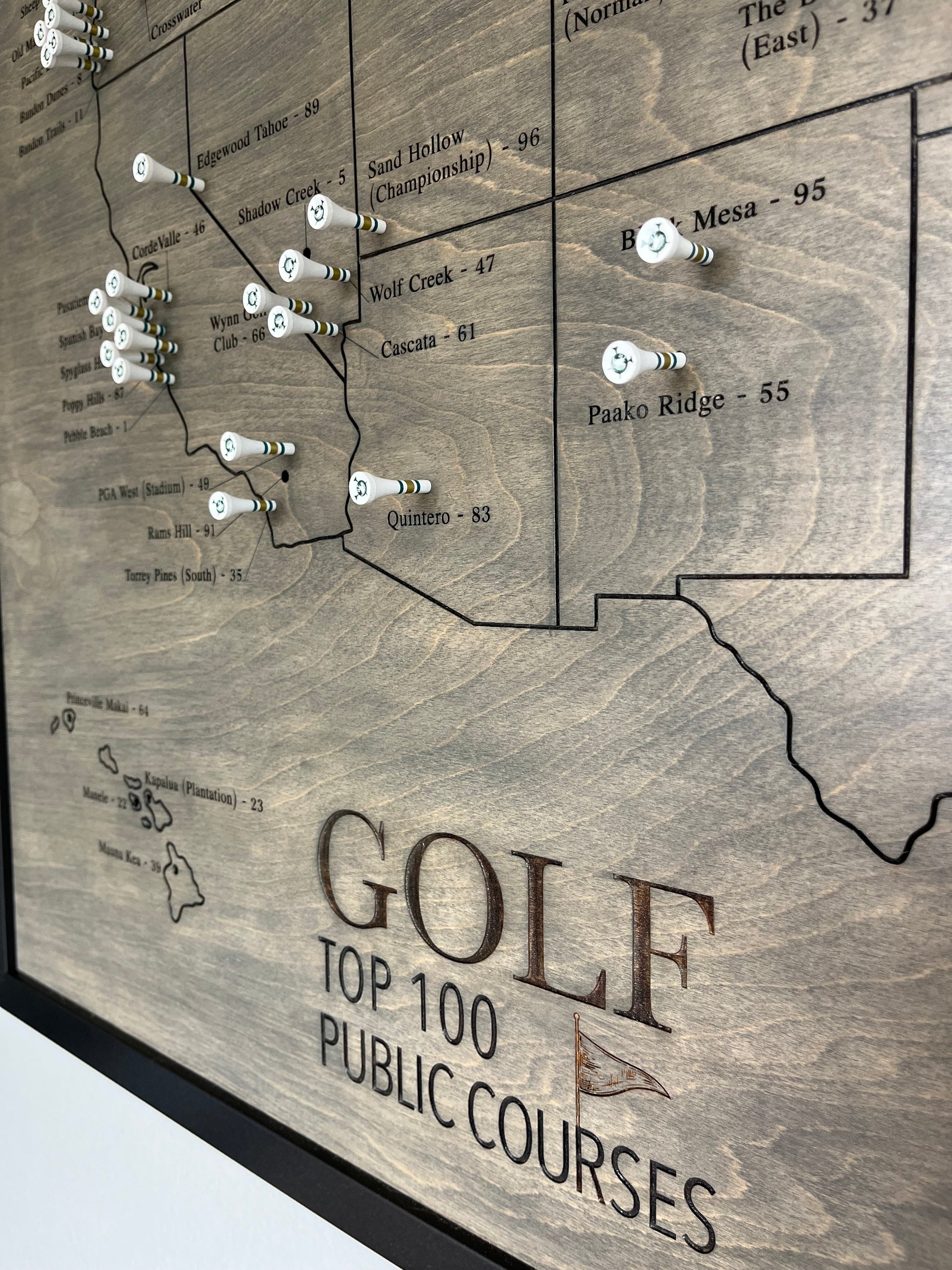 Our maps are crafted through precision CNC laser engraving on high-quality white birch wood, capturing the top 100 public golf courses with incredible detail over an 8-hour cutting process.